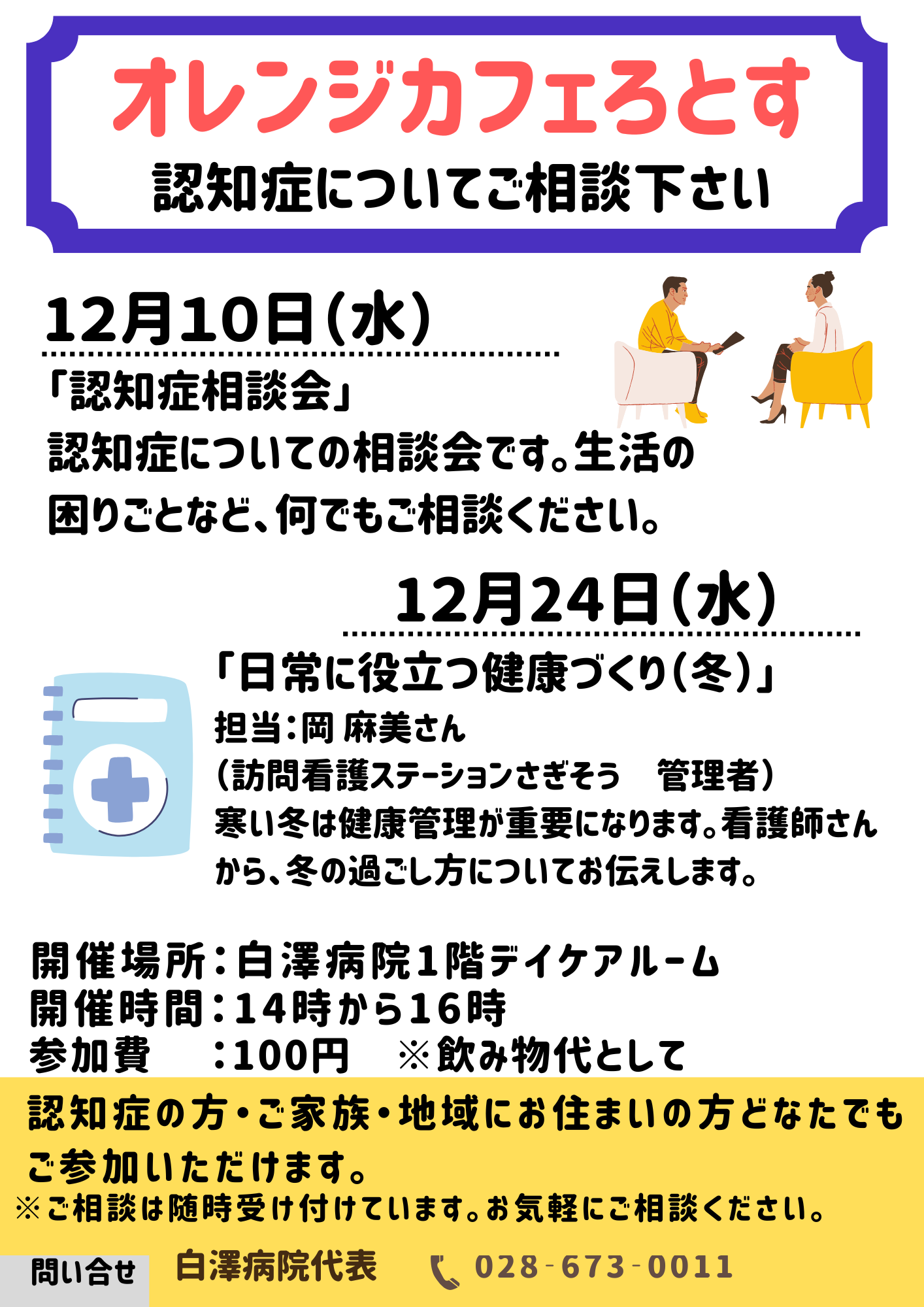 オレンジカフェろとすのご案内となります。寒くなりましたので、暖かくしてお越しください。