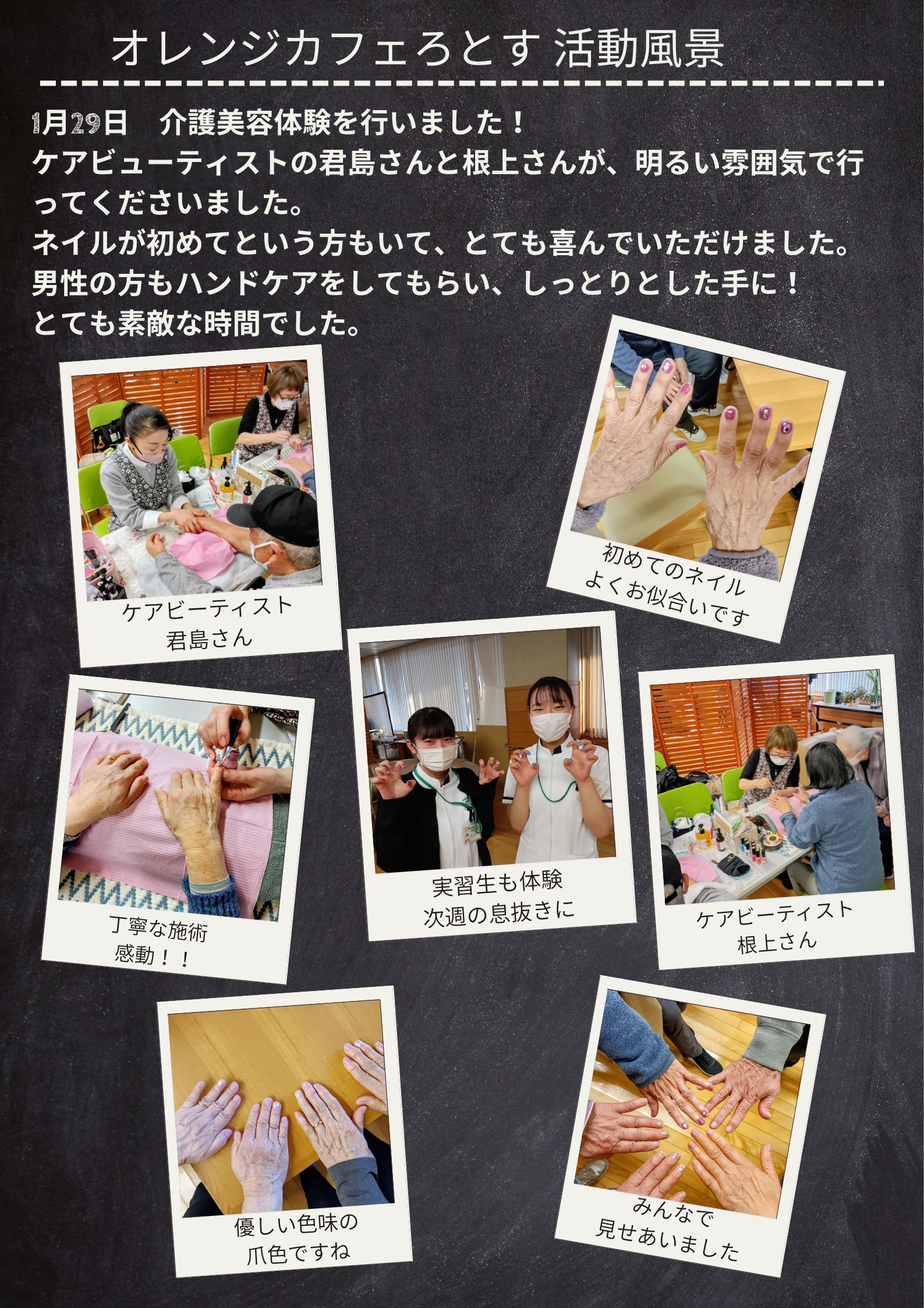 先日、1月28日(水)に、介護美容に携わっている、ケアビューティストの君島さんと根上さんにカフェにお越しいただき、ハンドケアやネイルをしてもらいました。男性参加者も、積極的に参加され、女性の参加者の方は「初めてネルをしてもらった!」と非常に喜んでいただきました。普段、施設や病院にいらっしゃる方たちは、制限された生活を余儀なくされます。介護美容に携わる、こういった方たちが入所者や入院患者の生活に潤いや刺激を与えることができるのだと、運営側も実感いたしました。活動風景をぜひご覧ください。